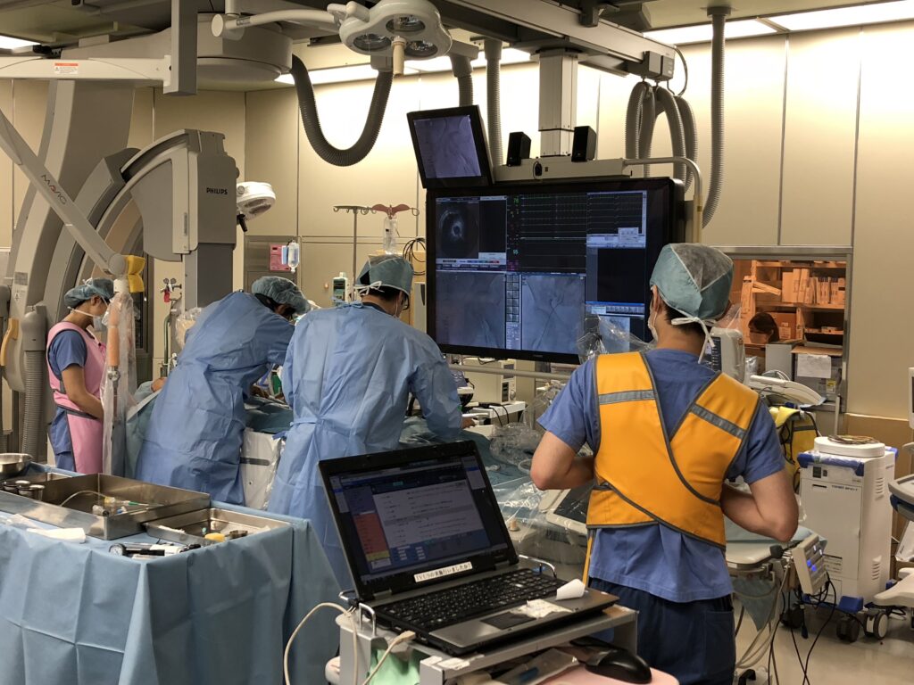 医師、看護師など多職種と連携して冠動脈疾患、末梢血管疾患、不整脈疾患などの検査・治療を行っております。当院では臨床工学技士はカテーテルを行う際に医師の助手につきカテーテルの操作補助やカテーテル治療時に使用される血管内超音波装置の操作などを行っています。他にもポリグラフ(多用途生体情報記録装置)の操作・記録、放射線装置の操作も臨床工学技士が行っています。緊急時の際には人工呼吸器、除細動器、体外式ペースメーカ、補助循環などの操作管理も行っております。